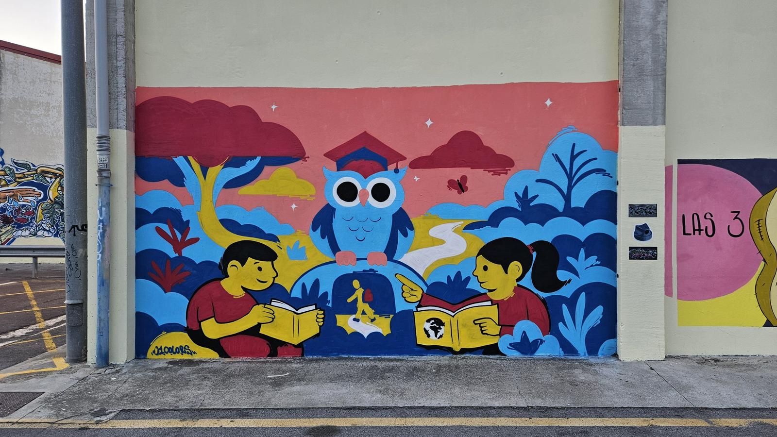 Siguiendo los colores y la temática propuestos, realizamos un mural que representa la educación como un proceso continuo, en el que el conocimiento nace en las aulas, pero crece y se transforma al entrar en contacto con la naturaleza, la comunidad y la experiencia vital.
